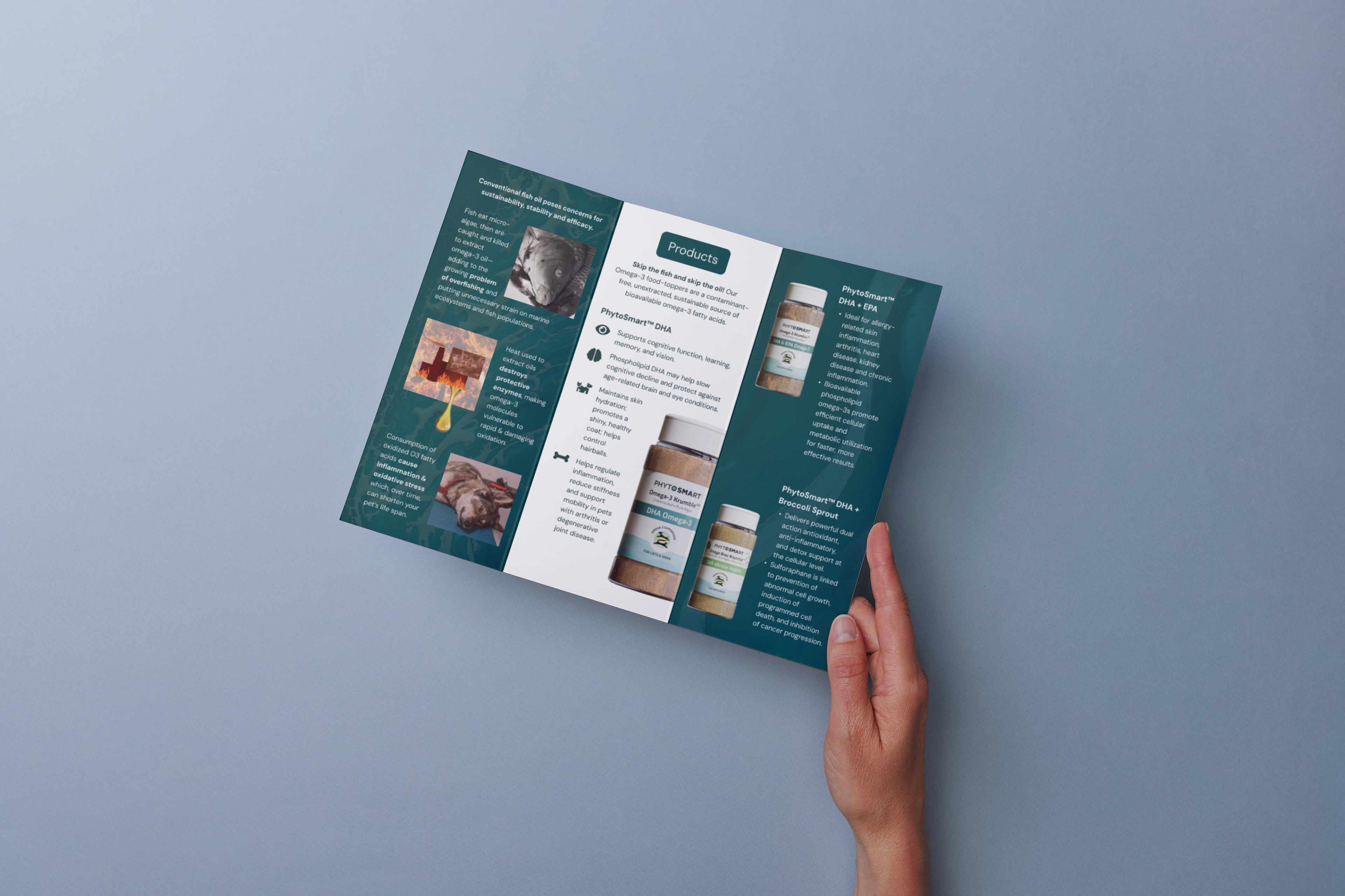 Working with Pet Industry Resource, I led design and creative direction for PhytoSmart, collaborating on the branding, website design, ads, social posts, and print materials. One specific deliverable I designed was a trifold. PhytoSmart wanted their former infographic content and imagery translated into a new design that matched their updated branding, the trifold I created to accomplish this can be seen below.